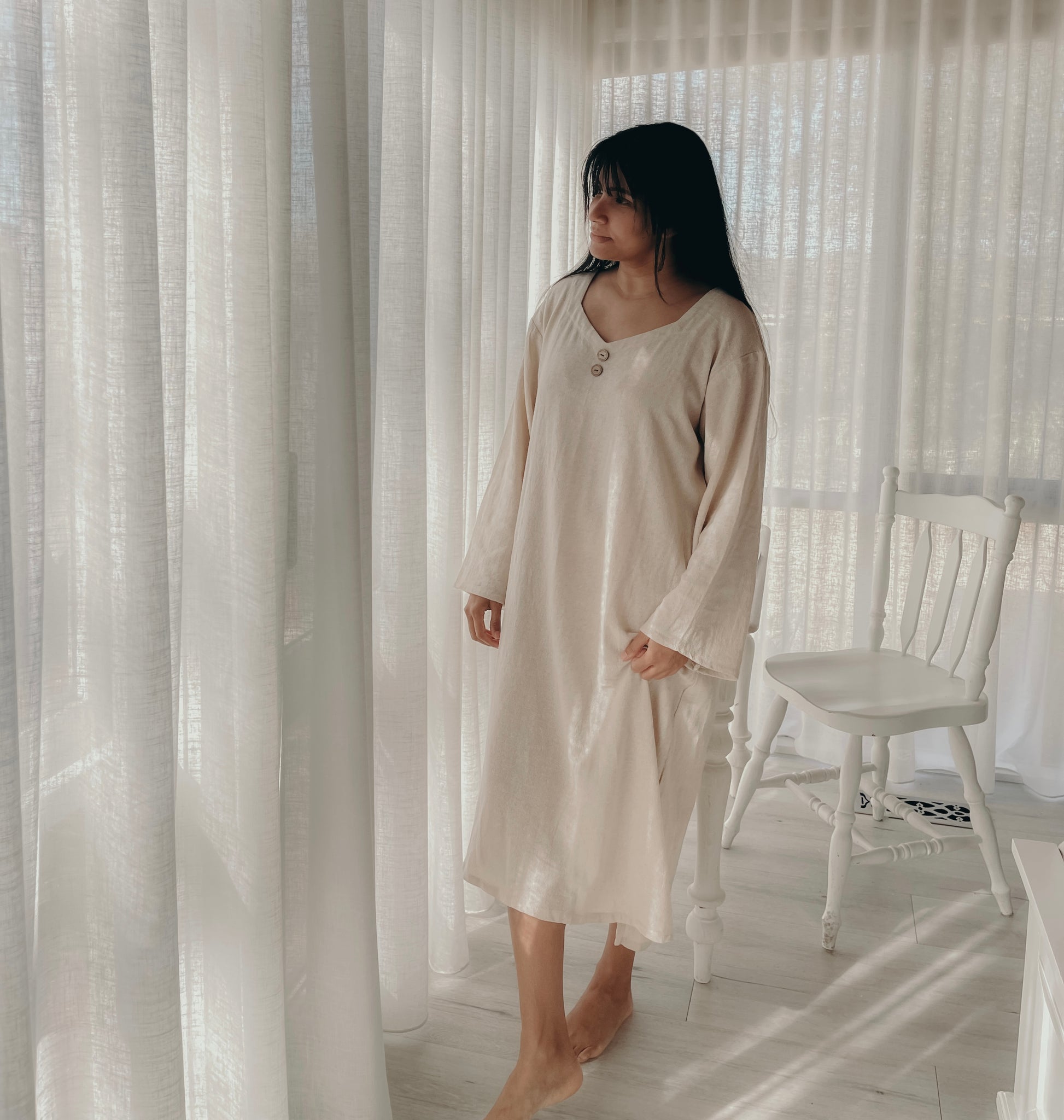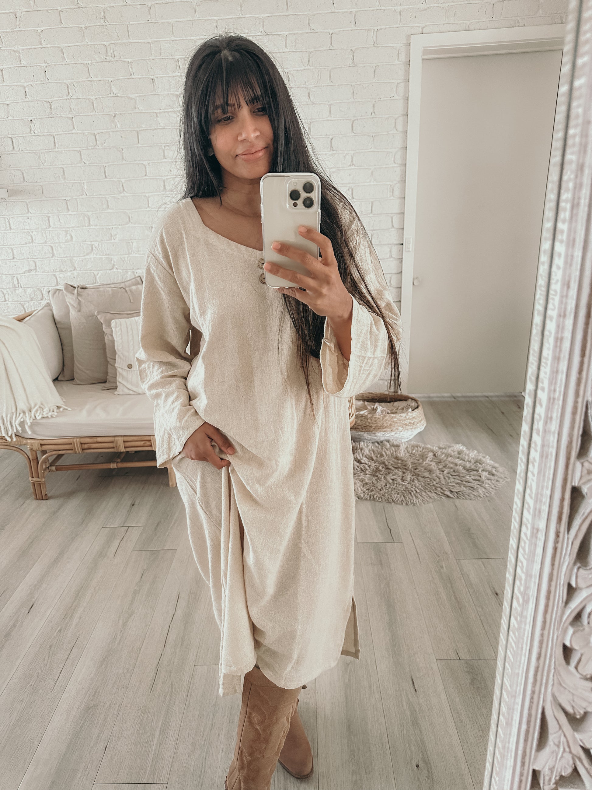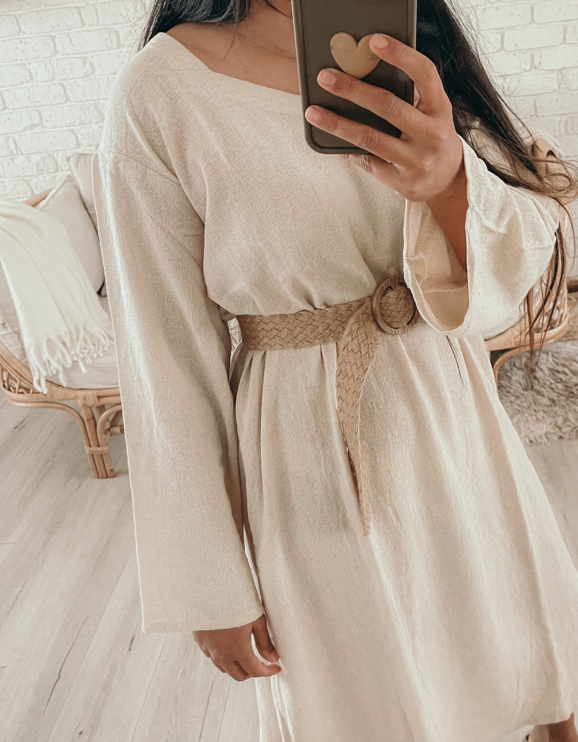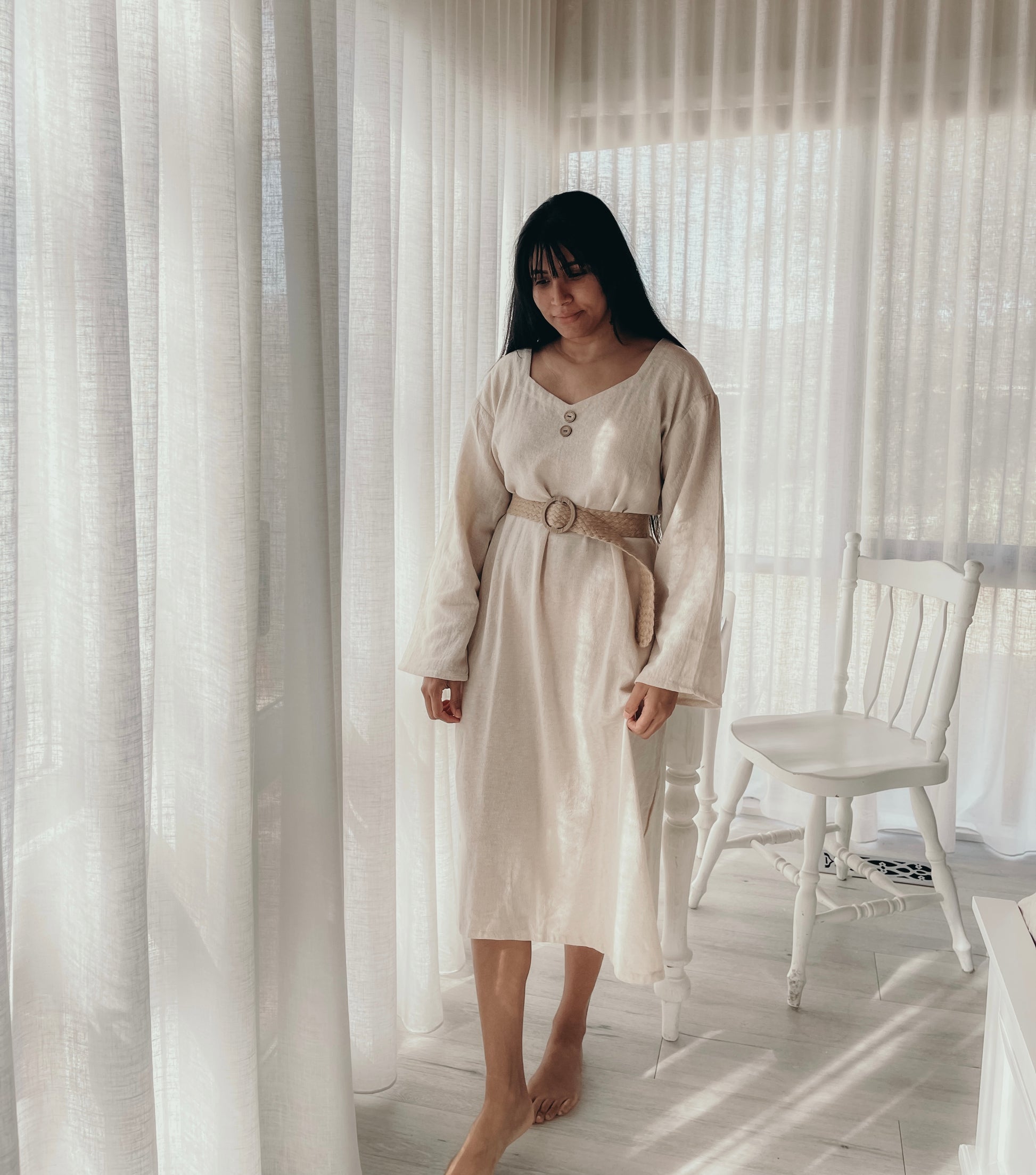 This GORGEOUS dress with its raw textured fabric looks & feels sumptuous on! Generously oversized for an effortless look or can be cinched in with a belt to show off your waistline. I'd returned here looking for pottery spoons (I'd broken one I'd purchased last year) but discovered Nikki's new clothing line and came away with this amazing dress! My parcel arrived way ahead of schedule. The presentation was exceptional, and to my surprise I discovered Nikki had thoughtfully gifted me a replacement spoon :) Thanks again so much Nikki :)