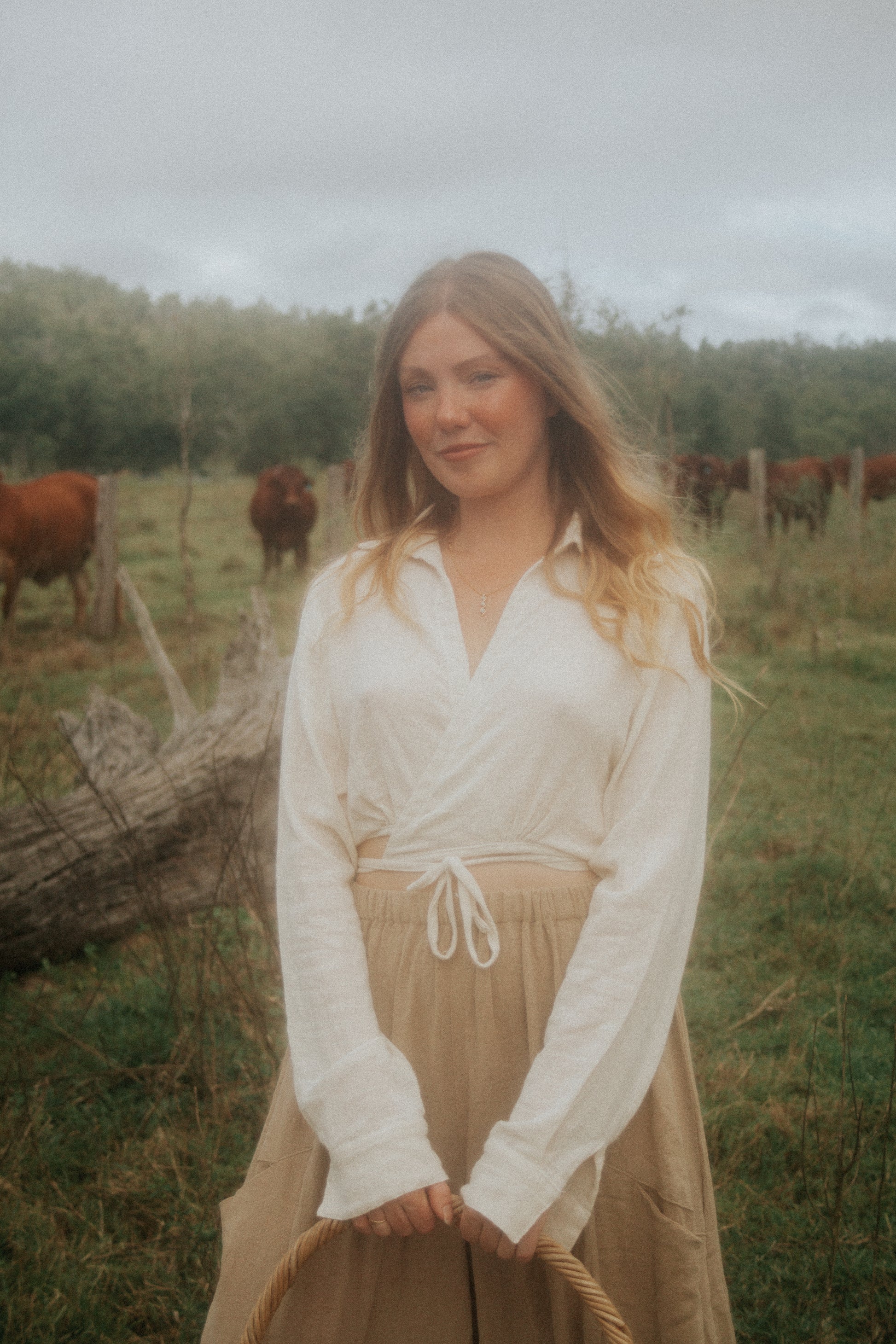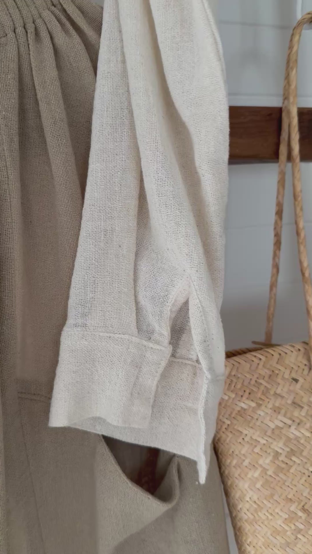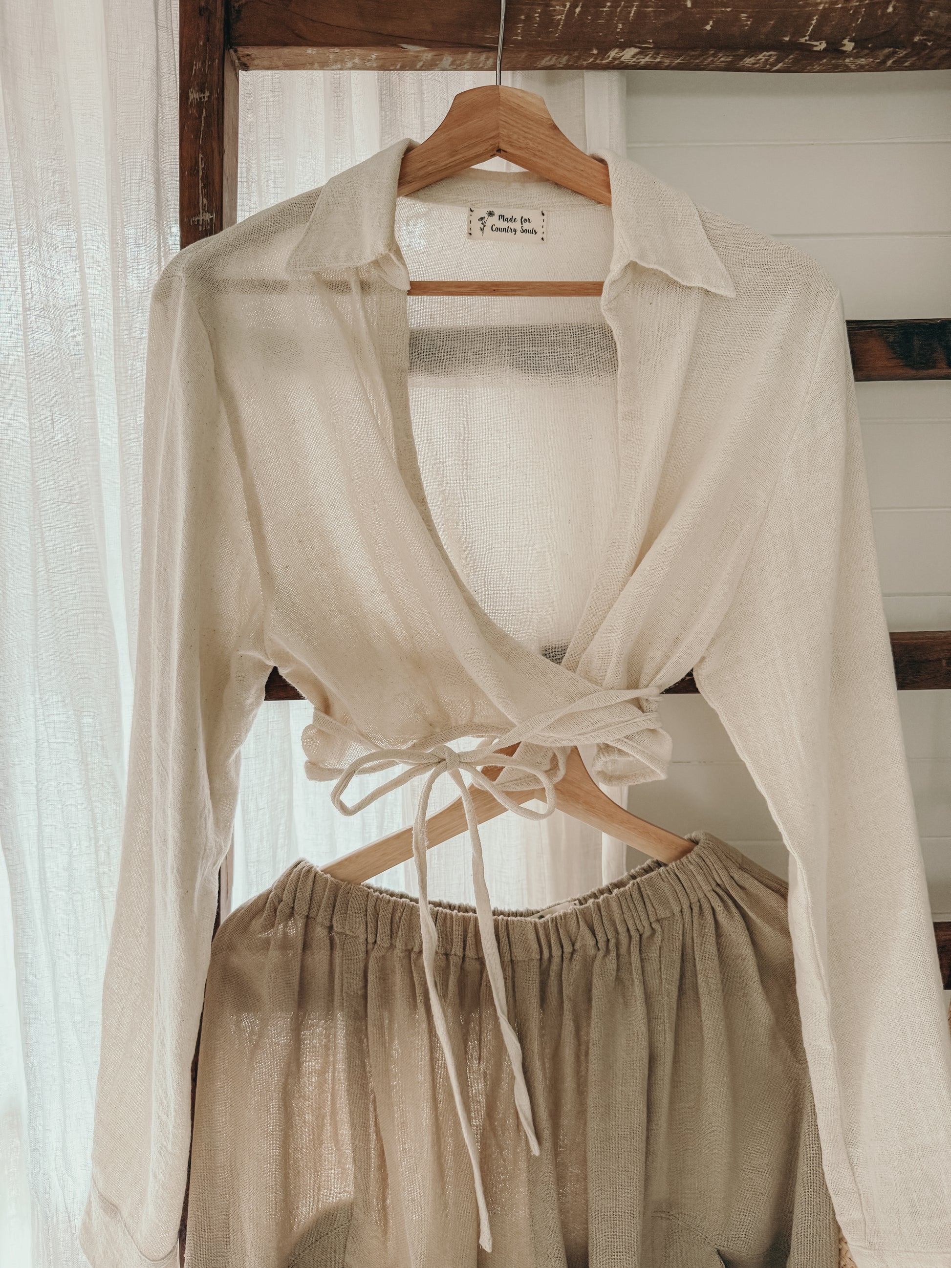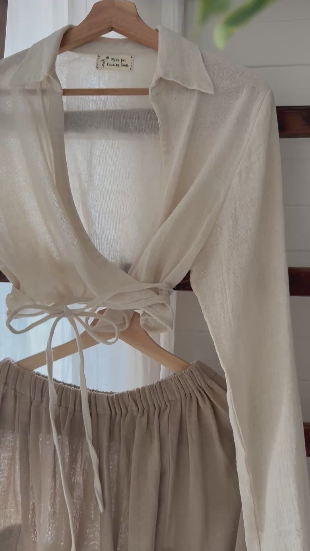 ~ Soft as a whisper, light as the breeze — this beautifully crafted wrap top is made from natural Ramie cotton. With its collared neckline, long sleeves, and delicate ties gently around the waist, it offers both structure and softness in perfect harmony. The subtle gathered detail at the back adds a touch of charm and flow. Ethically made and effortlessly elegant — a timeless piece to wear through every season ~