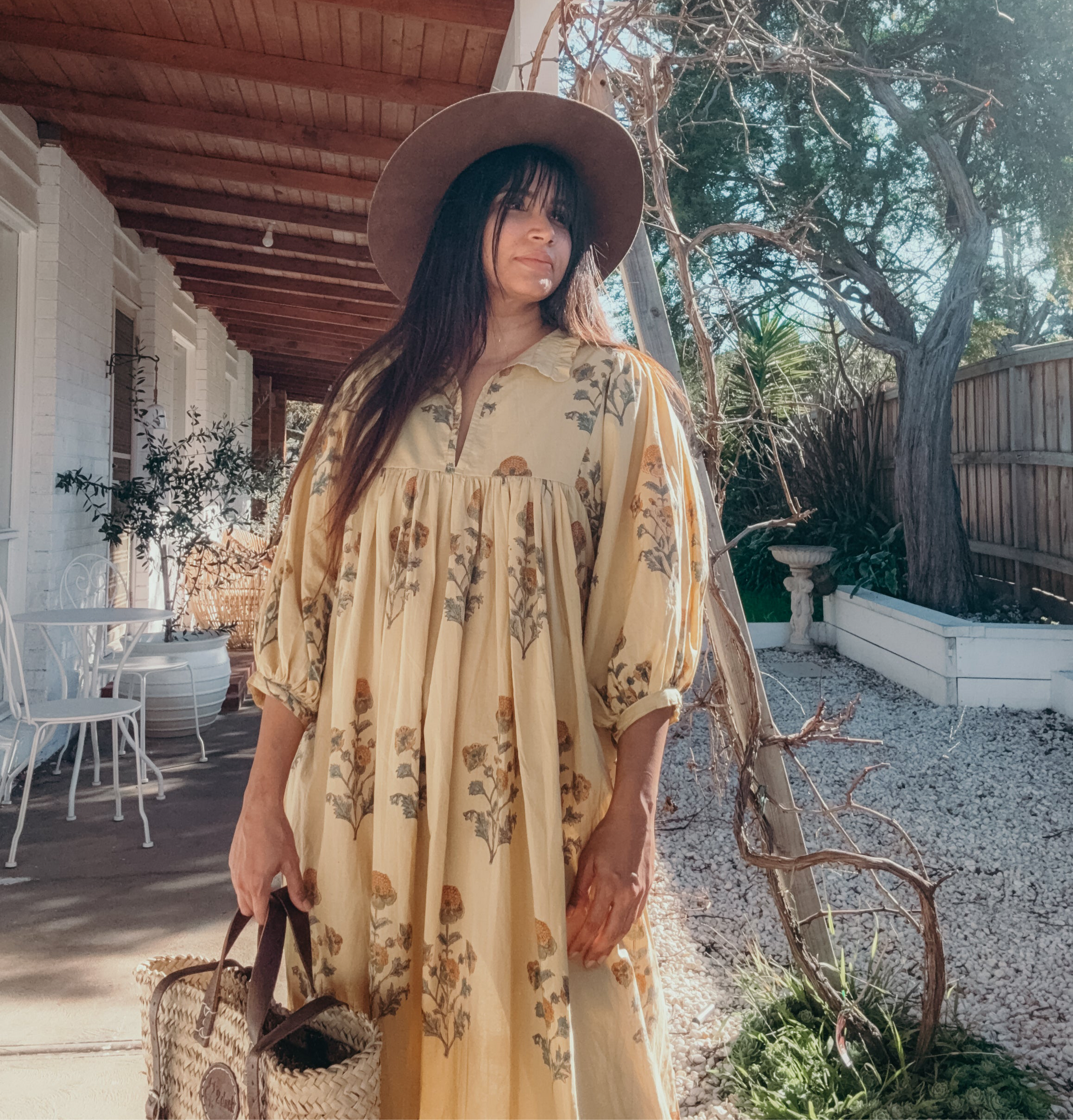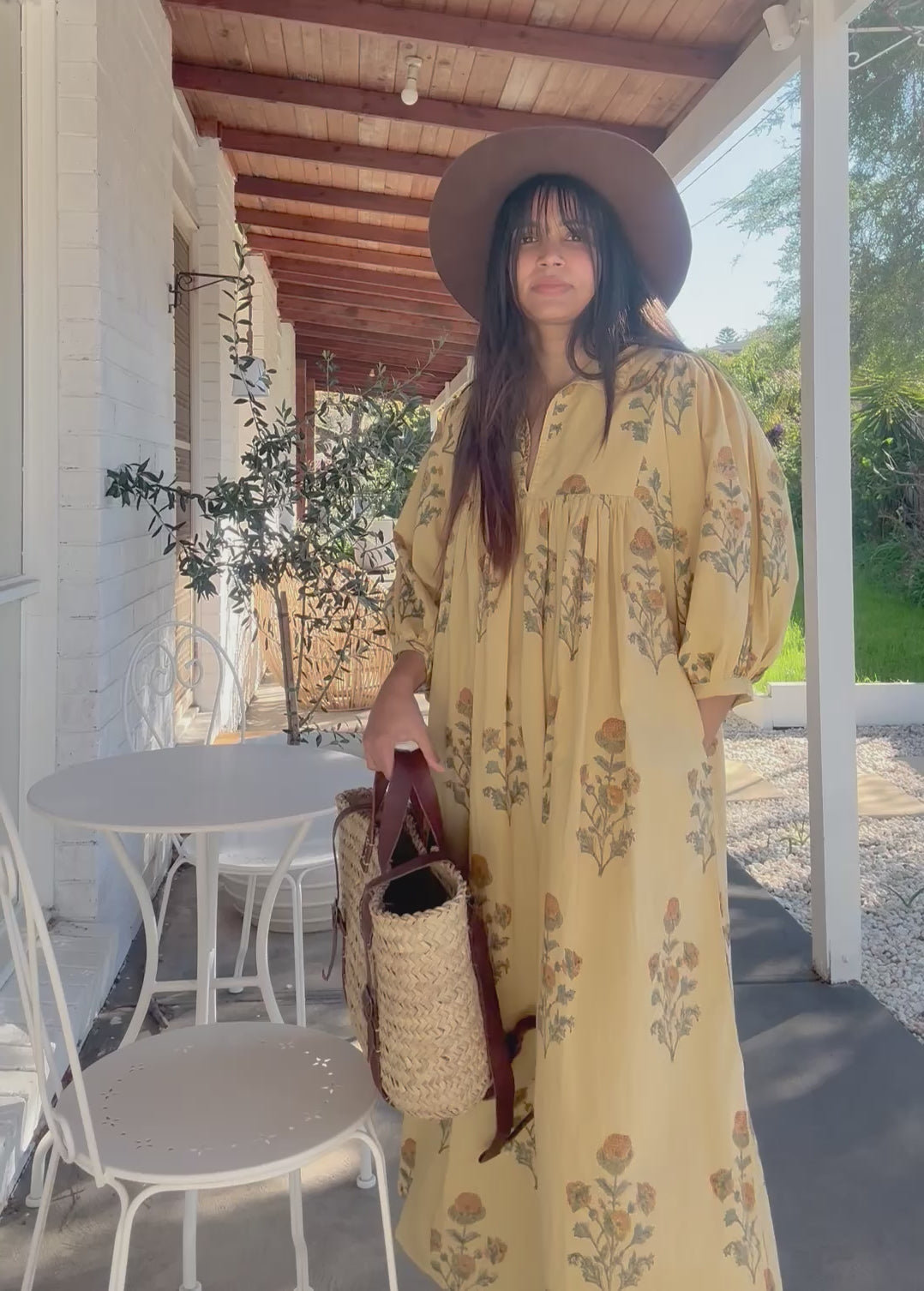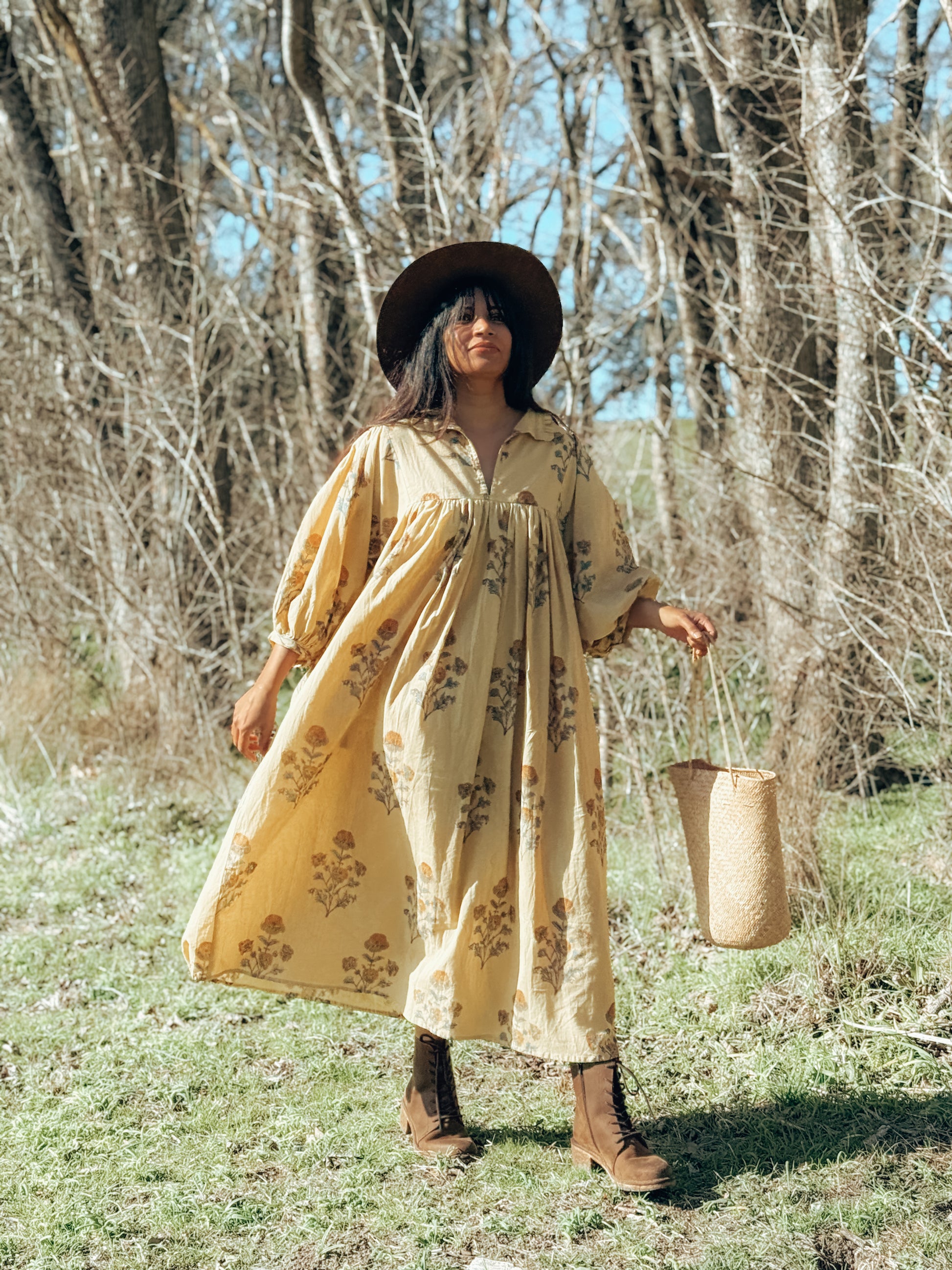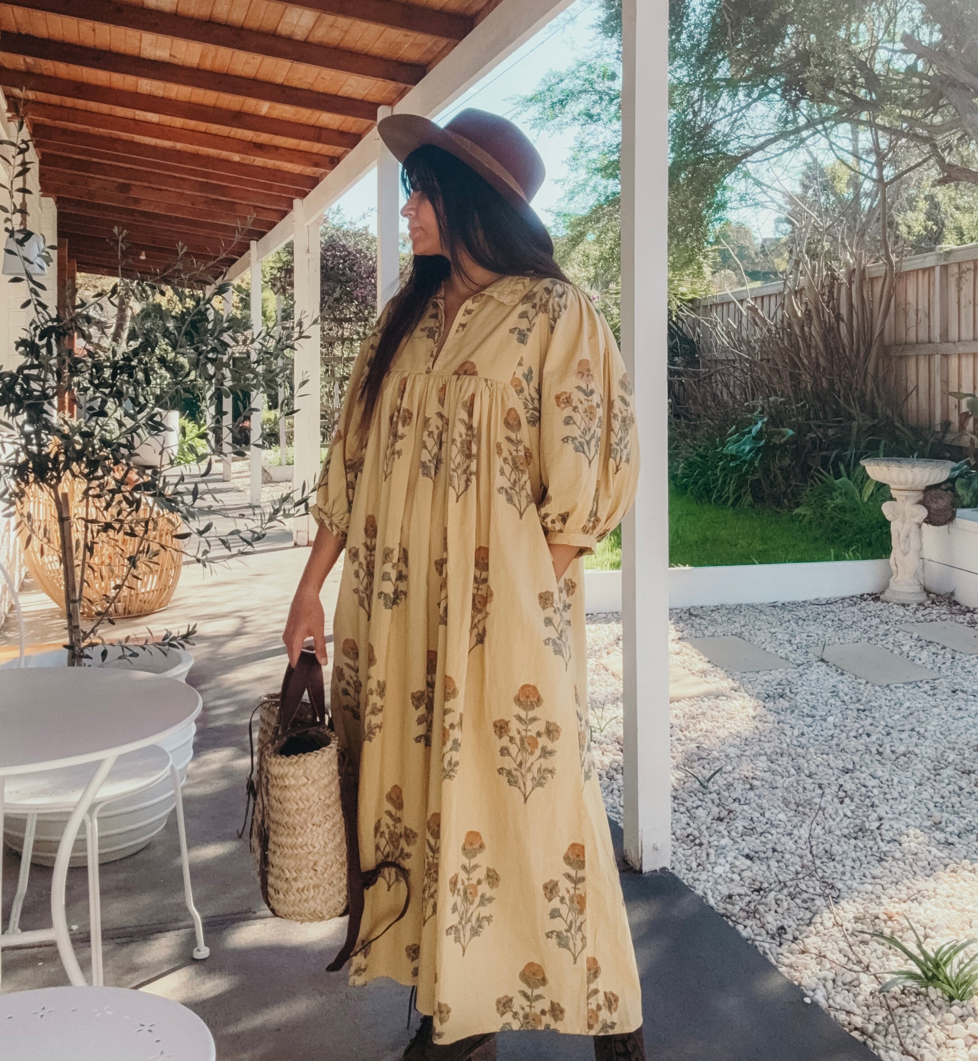 Eliana Maxi Dress — A sunlit dream, hand block printed on 100% cotton and crafted with love. With her billowing puff sleeves, gentle ruffle neckline, two pockets and golden yellow hue, she carries the warmth of endless summer days. Soft as a feather against the skin, Eliana is a timeless treasure to be worn, loved, and cherished season after season.