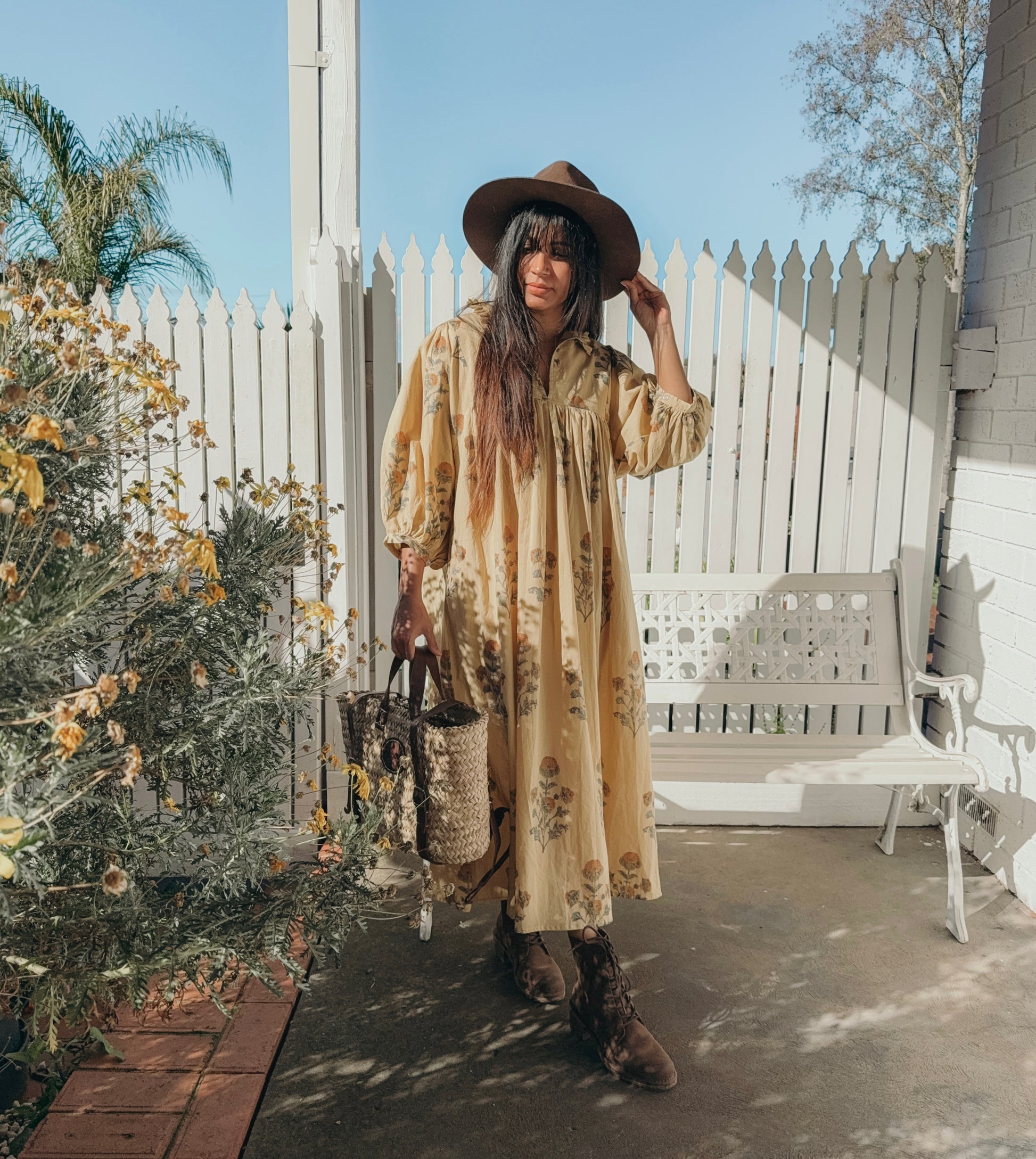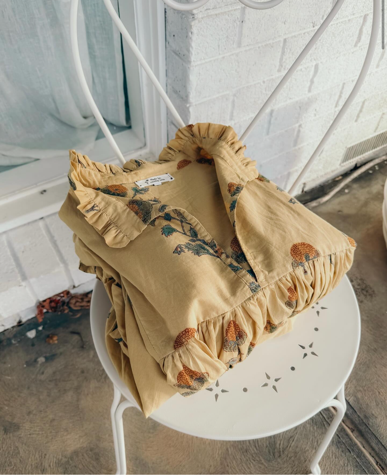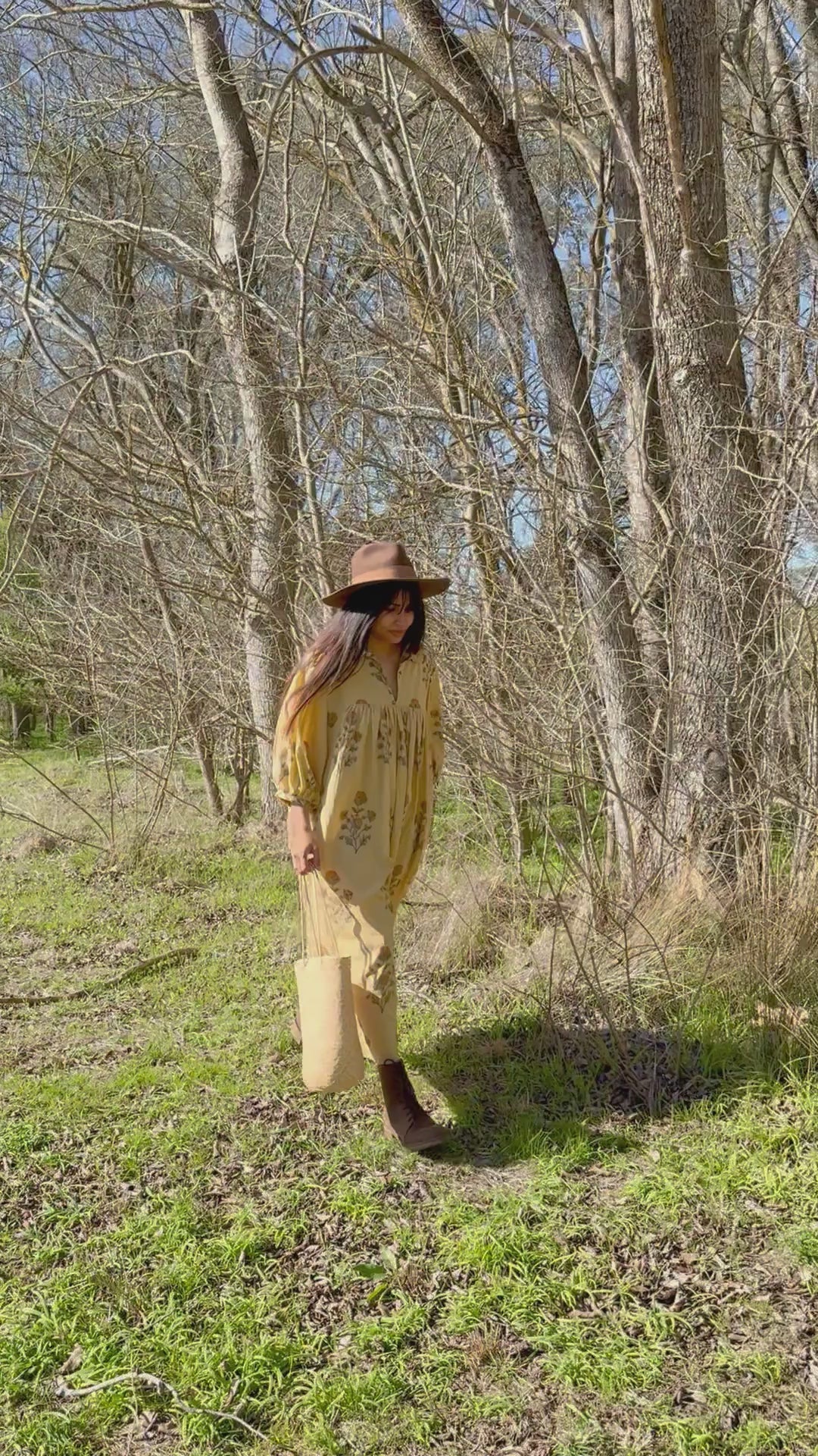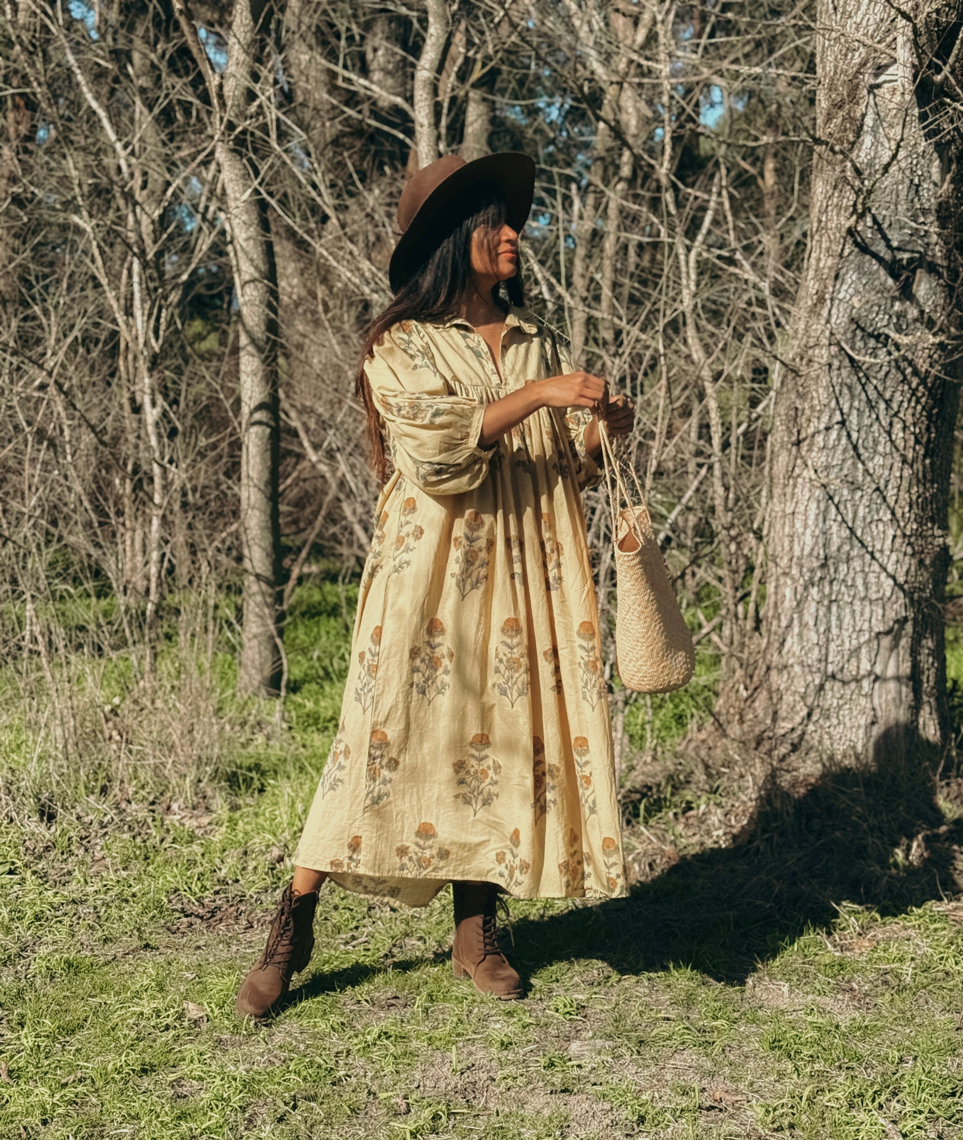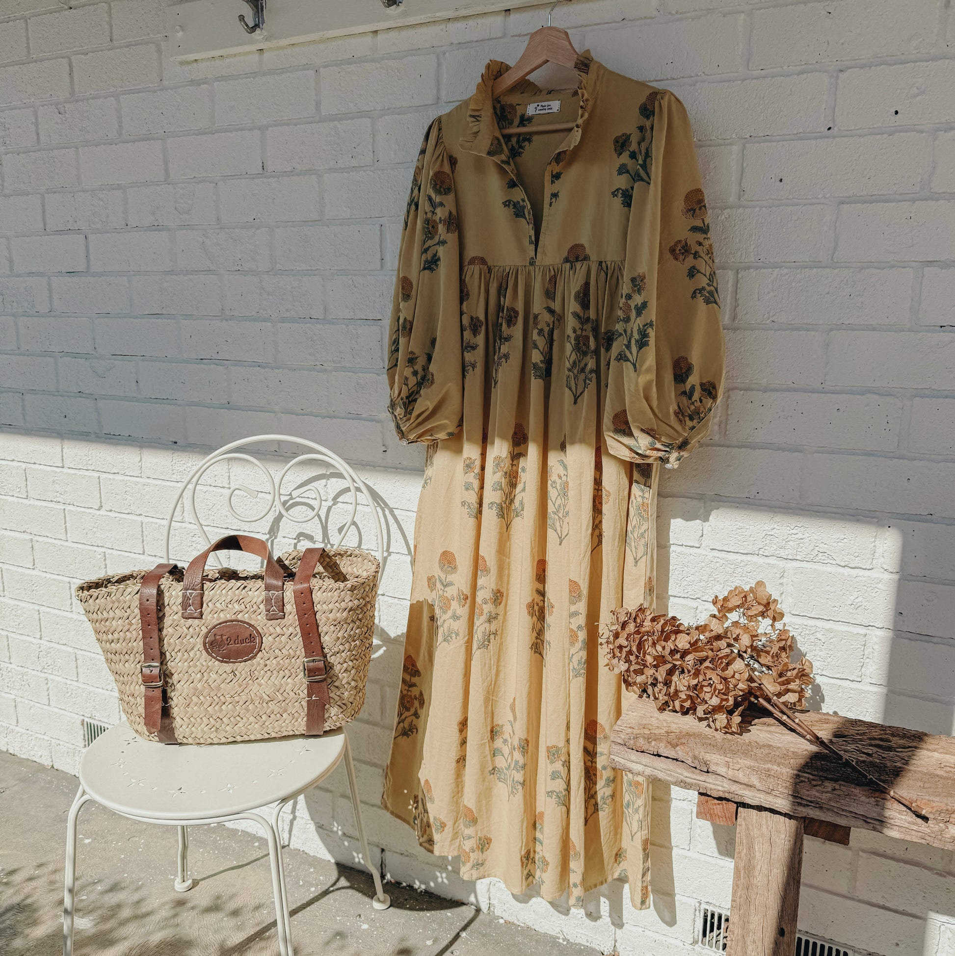 Eliana Maxi Dress — A sunlit dream, hand block printed on 100% cotton and crafted with love. With her billowing puff sleeves, gentle ruffle neckline, two pockets and golden yellow hue, she carries the warmth of endless summer days. Soft as a feather against the skin, Eliana is a timeless treasure to be worn, loved, and cherished season after season.