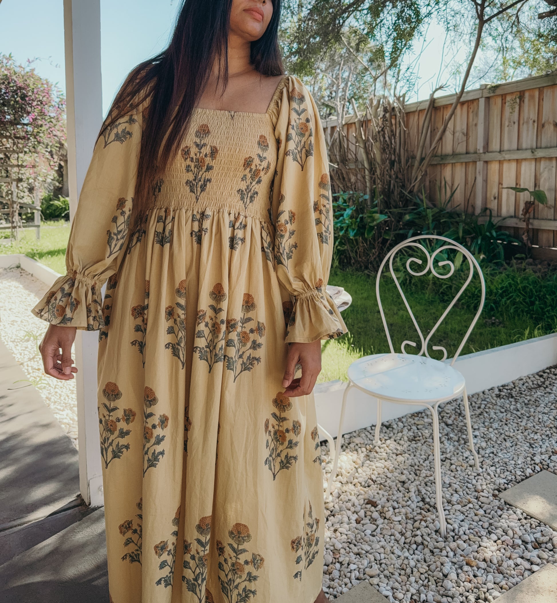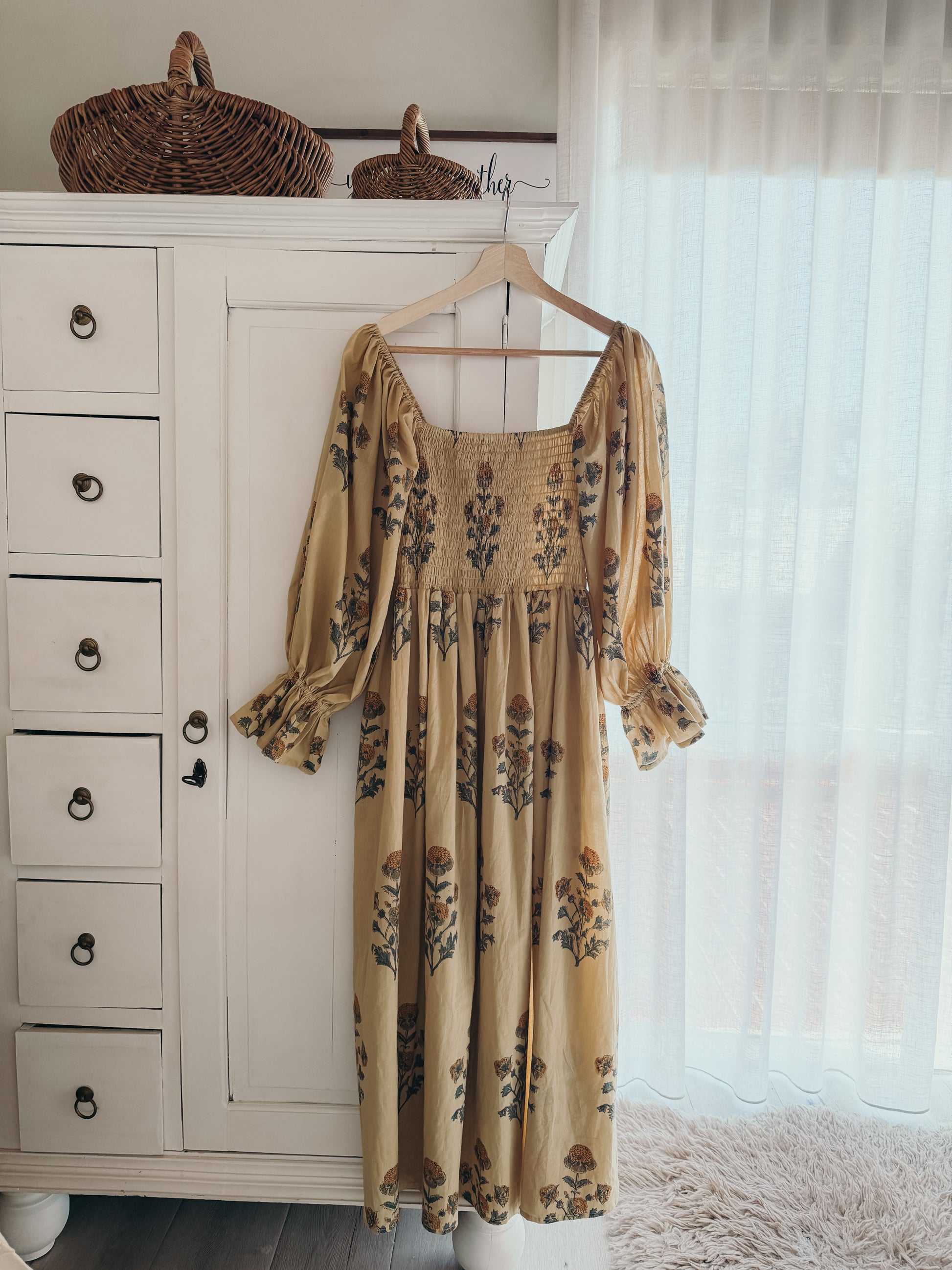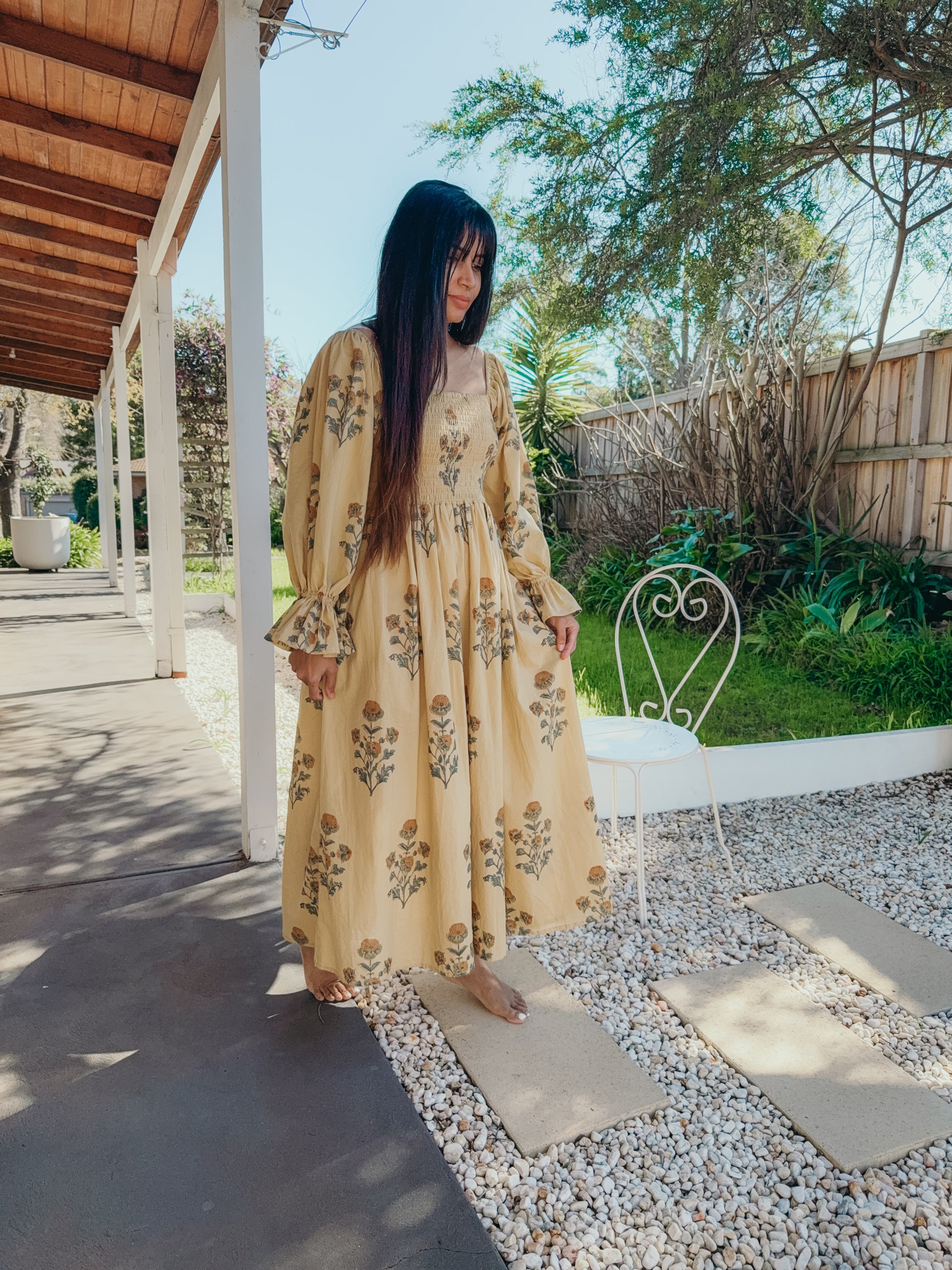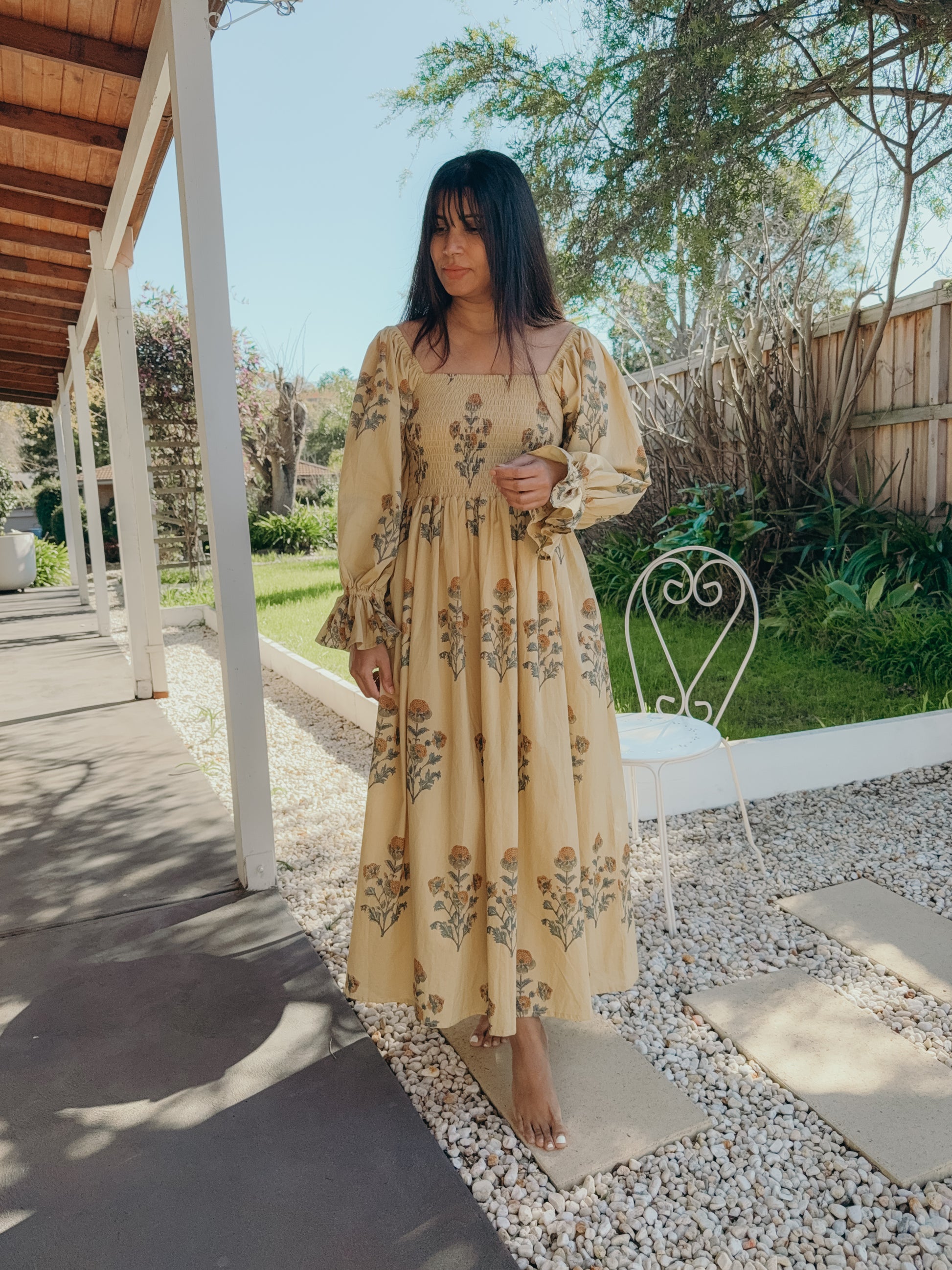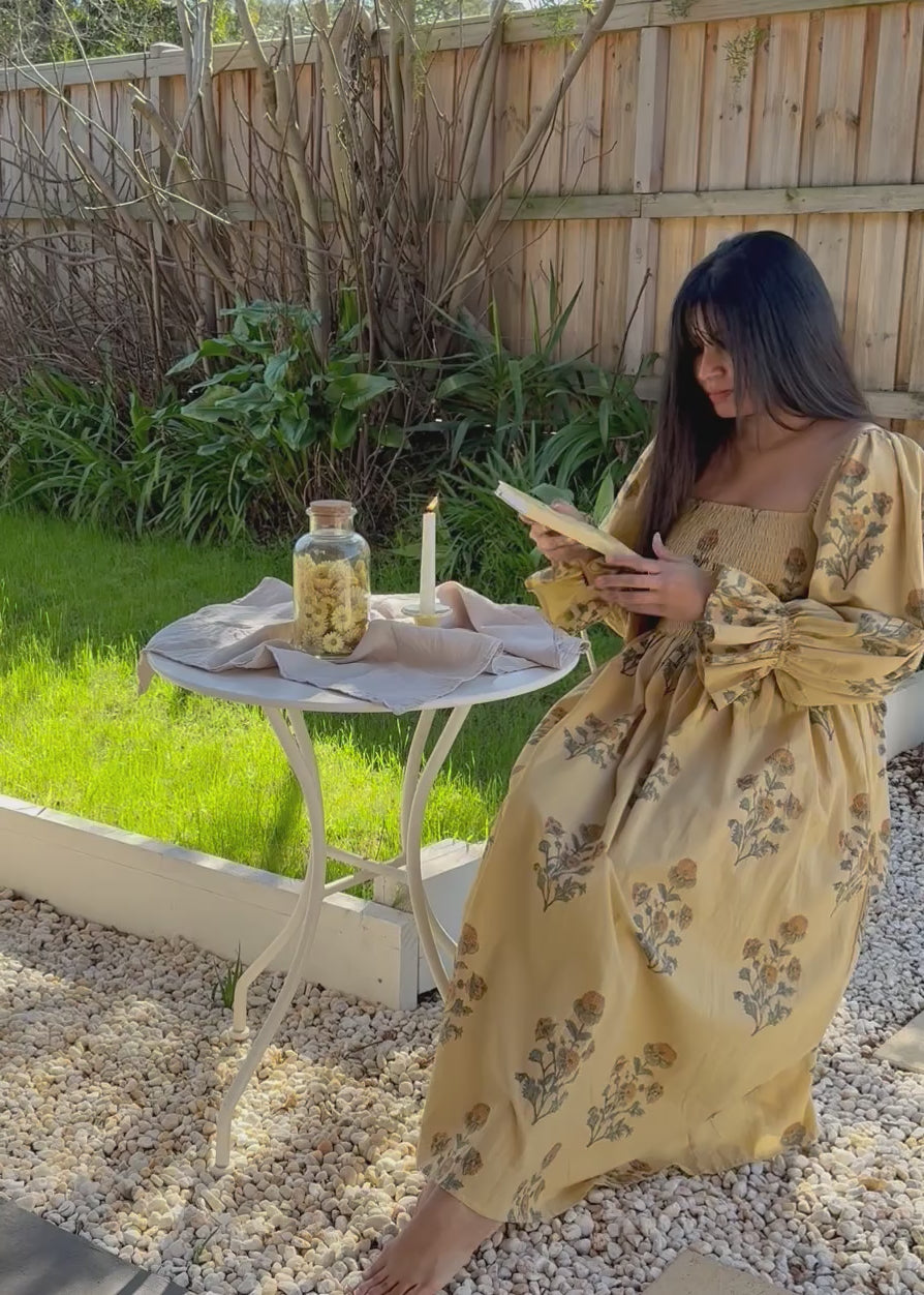 Florence Dress ~ A gentle ode to slow living, hand block printed on 100% cambric cotton and lovingly made in India. With long puff sleeves, a shirred bust that embraces with ease, and a graceful maxi length, it moves like poetry in motion. Bathed in a warm mustard yellow and scattered with floral prints, Florence carries the charm of golden fields in bloom. A timeless piece, made with love to be cherished. 🌼