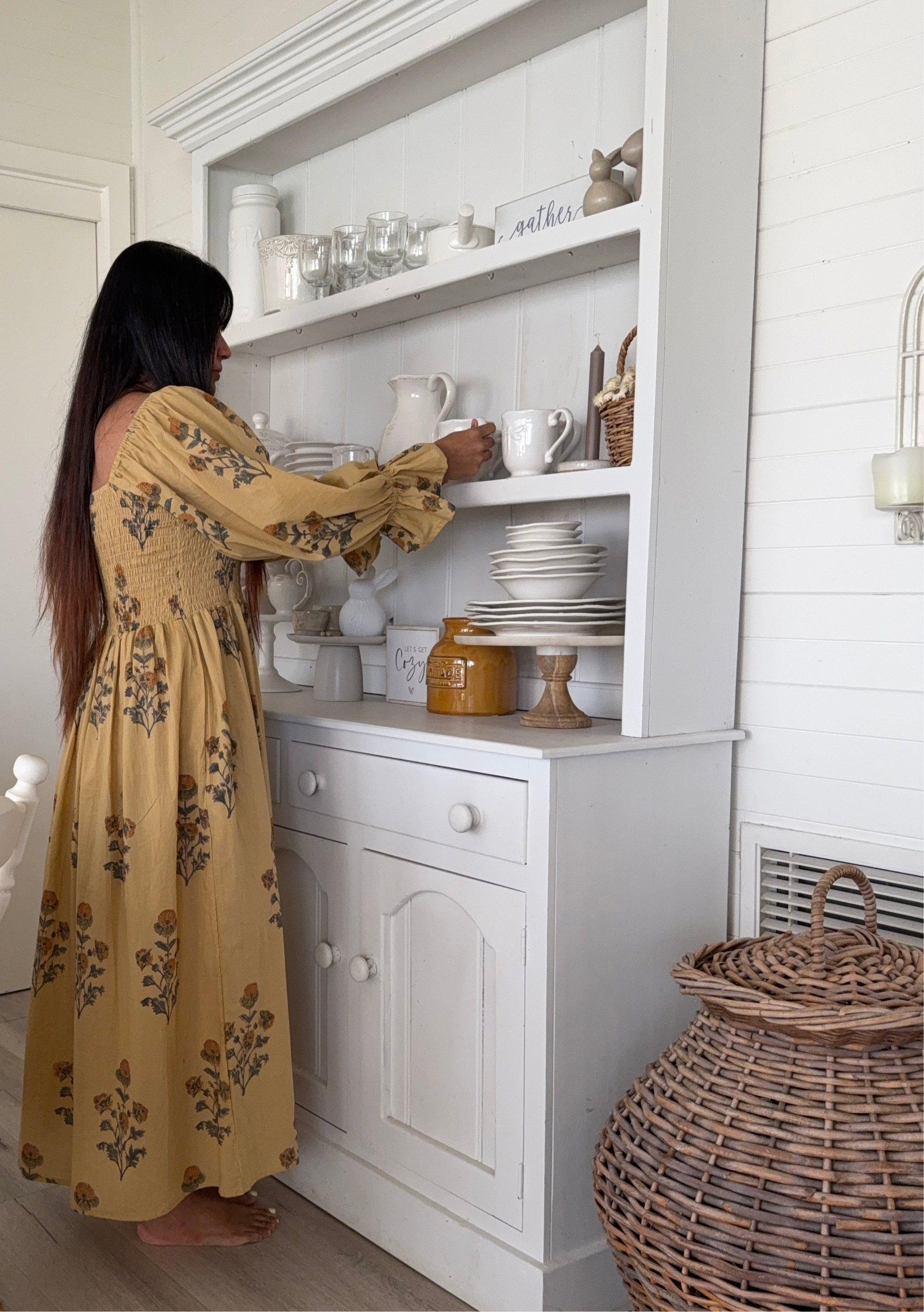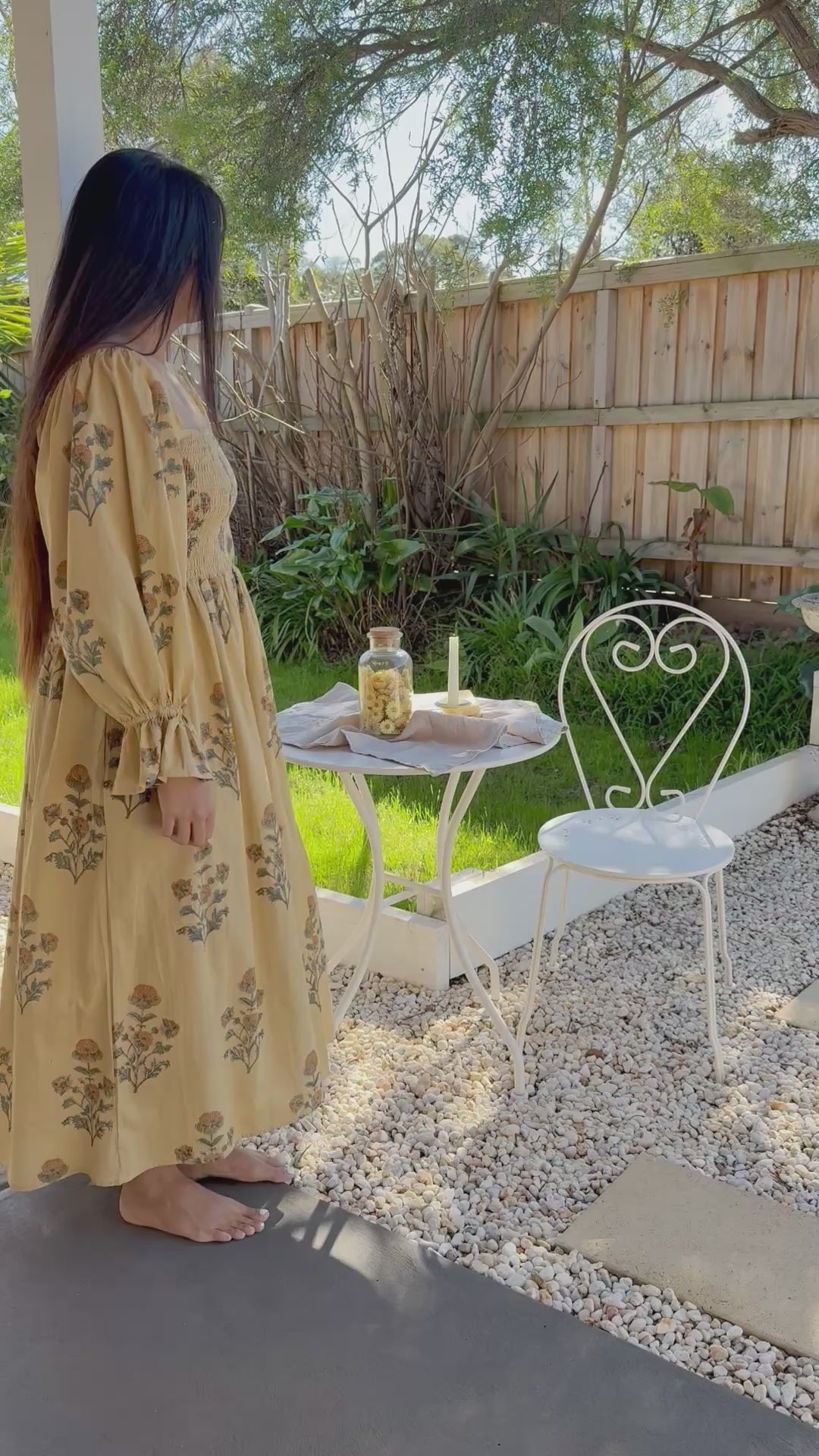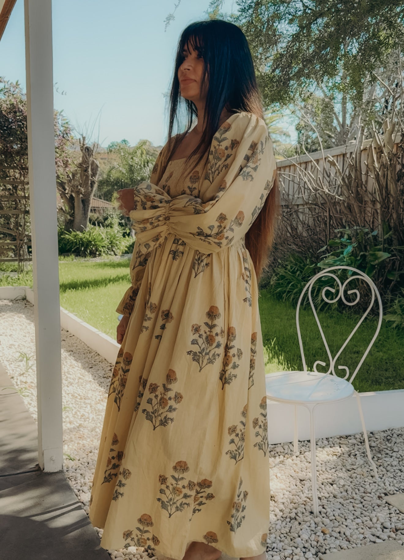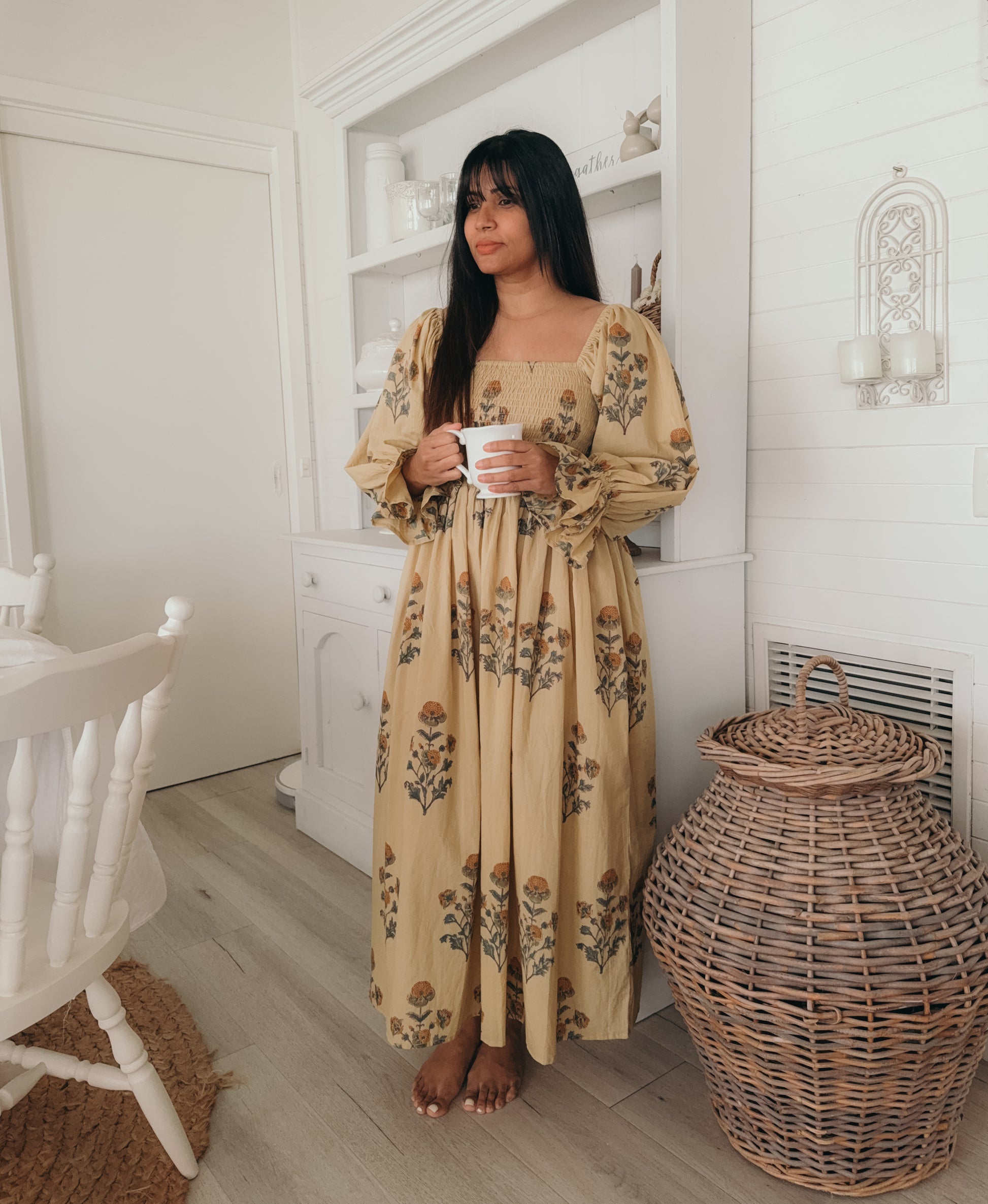 Florence Dress ~ A gentle ode to slow living, hand block printed on 100% cambric cotton and lovingly made in India. With long puff sleeves, a shirred bust that embraces with ease, and a graceful maxi length, it moves like poetry in motion. Bathed in a warm mustard yellow and scattered with floral prints, Florence carries the charm of golden fields in bloom. A timeless piece, made with love to be cherished. 🌼