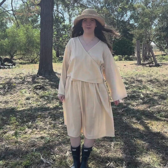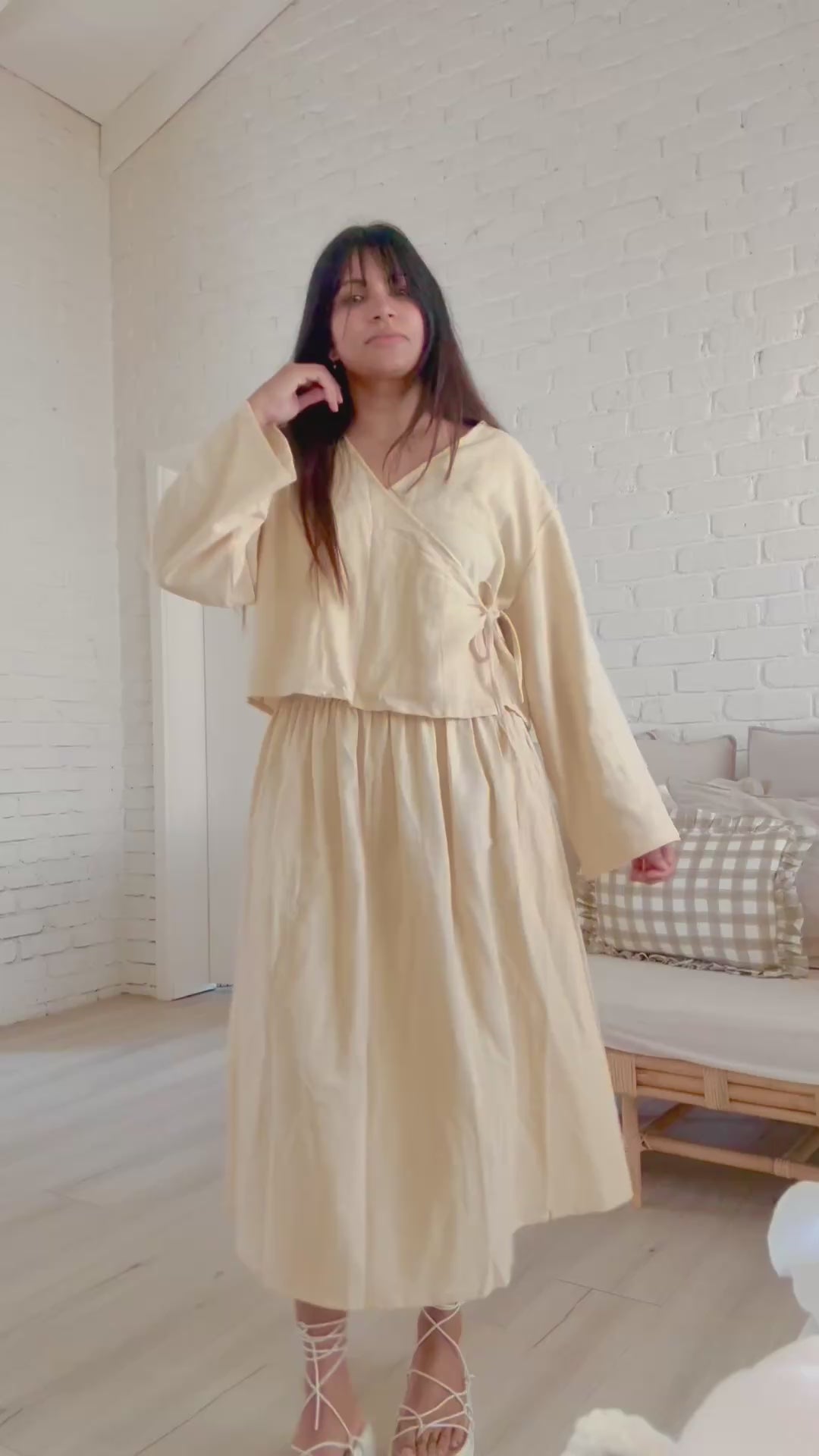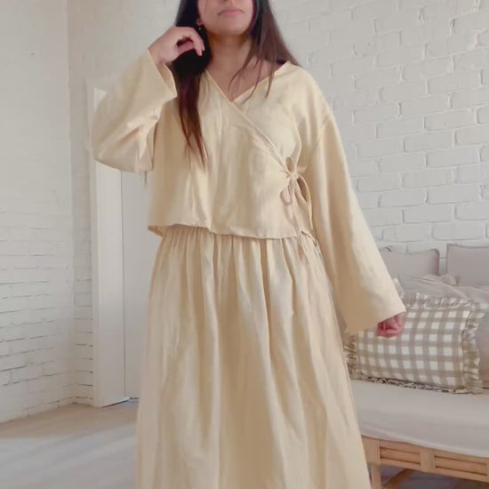 A wrap top with gentle long sleeves, made for ease and breastfeeding-friendly moments,